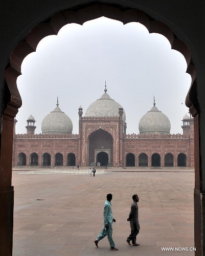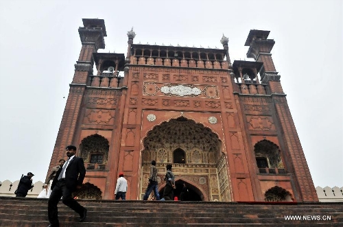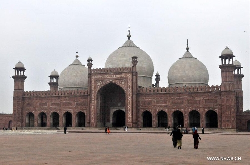Tourists visit the Badshahi Mosque in eastern Pakistan's Lahore on Feb. 9, 2014. The Badshahi Mosque meaning the 'Imperial Mosque', which was commissioned by the sixth Mughal Emperor Aurangzeb in 1671 and completed in 1673, is the second largest mosque in Pakistan and South Asia and the fifth largest mosque in the world. Epitomizing the beauty, passion and grandeur of the Mughal era, it is Lahore's most famous landmark and a major tourist attraction. (Xinhua/Jamil Ahmed)