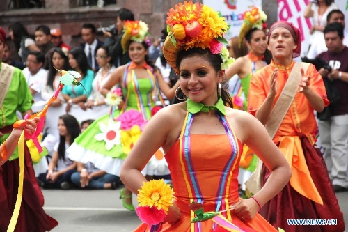 An Ecuadorian girl dances during the parade of the Festival of Fruit and Flowers held in Ambato, Ecuador, on March 2, 2014. The annual carnival of Ambato, which abounds with flowers and fruits, is a major tourist attraction in Ecuador. (Xinhua/Liang Junqian)