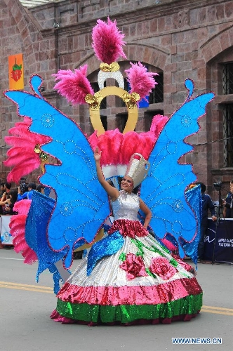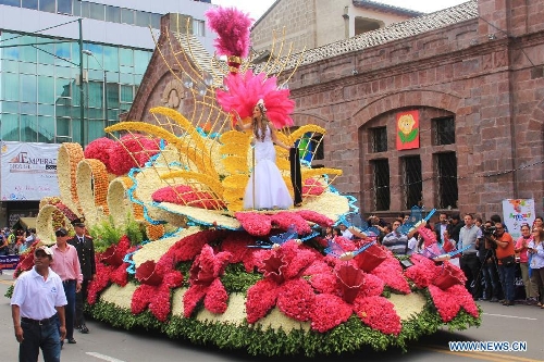 The Beauty Queen of Ambato rides on a decorated float during the parade of the Festival of Fruit and Flowers held in Ambato, Ecuador, on March 2, 2014. The annual carnival of Ambato, which abounds with flowers and fruits, is a major tourist attraction in Ecuador. (Xinhua/Liang Junqian)