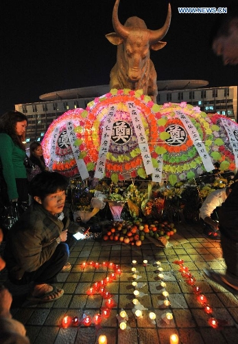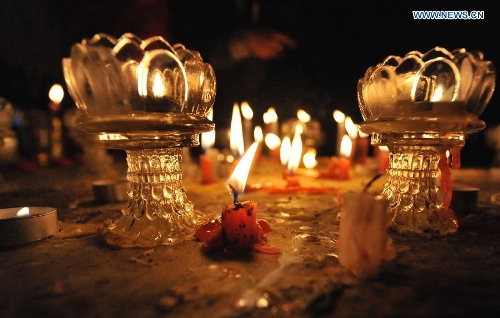 Candlelights are seen at a gathering held to mourn for victims killed by knife-wielding attackers at Kunming Railway Station in Kunming of southwest China's Yunnan Province, March 3, 2014. Chinese police said Monday in a statement that three suspects involved in the terrorist attack had been captured, and the terrorist gang of eight members led by Abdurehim Kurban was responsible for the attack. Police shot and killed four of them and captured an injured female at the scene on Saturday night, the statement said. (Xinhua/Lin Yiguang)