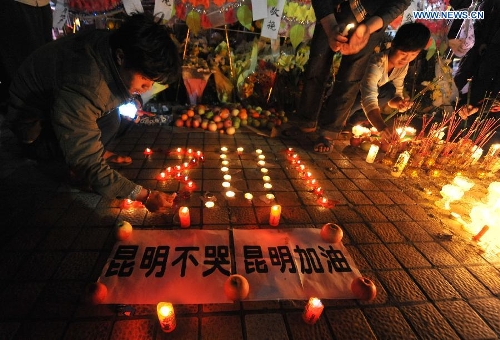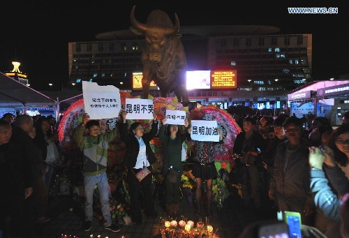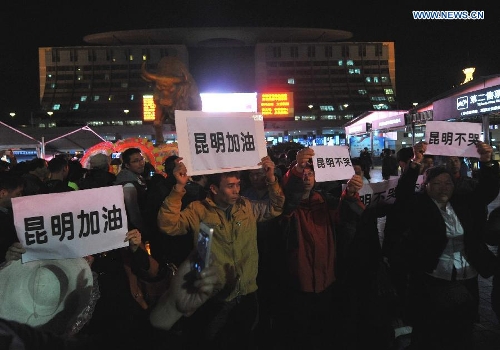 People attend an gathering to mourn for victims killed by knife-wielding attackers at Kunming Railway Station in Kunming of southwest China's Yunnan Province, March 3, 2014. Chinese police said Monday in a statement that three suspects involved in the terrorist attack had been captured, and the terrorist gang of eight members led by Abdurehim Kurban was responsible for the attack. Police shot and killed four of them and captured an injured female at the scene on Saturday night, the statement said. (Xinhua/Lin Yiguang)