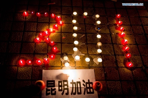 People attend a candlelight vigil to mourn for victims killed by knife-wielding attackers at Kunming Railway Station in Kunming of southwest China's Yunnan Province, March 3, 2014. Chinese police said Monday in a statement that three suspects involved in the terrorist attack had been captured, and the terrorist gang of eight members led by Abdurehim Kurban was responsible for the attack. Police shot and killed four of them and captured an injured female at the scene on Saturday night, the statement said. (Xinhua/Lin Yiguang)