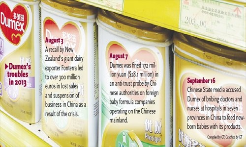 "2013 saw the market share of Dumex fall from 12 percent to today's 6 percent," Chen Lianfang, an analyst from Beijing Orient Agribusiness Consultant, told the Global Times Wednesday.