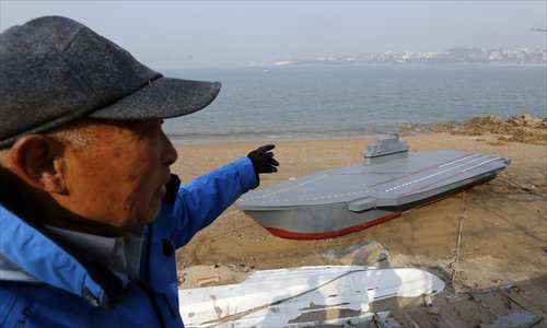 Wen Yuzhu, 80, points to his unfinished replica of China's first aircraft carrier Liaoning in Qingdao, Shandong Province on March 5. Wen said he has worked on the 12-meter long model for a month as a gift for his grandson. Photo: CFP/news.163.com