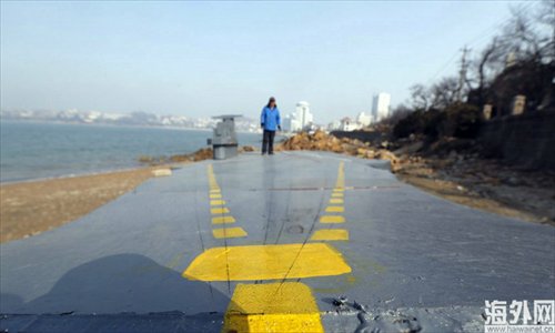 Wen boards his mini aircraft carrier on a beach near Huiquan Road in Qingdao, Shandong Province on March 5. Photo: CFP/haiwainet.cn