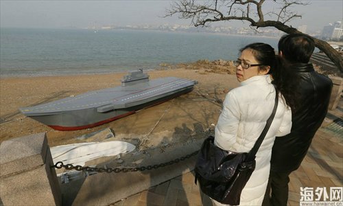 Passers-by take a peak at the aircraft carrier model in Qingdao, Shandong Province on March 5. Photo: CFP/haiwainet.cn
