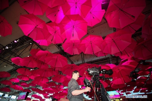 A cameraman works at the Deutsche Telekom's stand of the CeBIT tech fair in Hanover, Germany, March 8, 2014. CeBIT, the world's leading exhibition in the communication and information technology industry, will open to public on Monday in Hanover, Germany. The five-day event attracts about 3,500 exhibitors from 70 different countries and regions. (Xinhua/Zhang Fan)