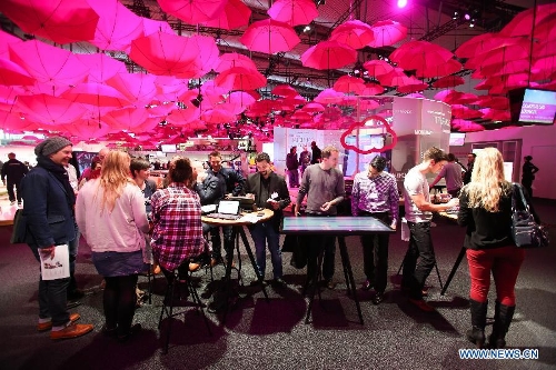 Visitors gather at the Deutsche Telekom's stand of the CeBIT tech fair in Hanover, Germany, March 8, 2014. CeBIT, the world's leading exhibition in the communication and information technology industry, will open to public on Monday in Hanover, Germany. The five-day event attracts about 3,500 exhibitors from 70 different countries and regions. (Xinhua/Zhang Fan)