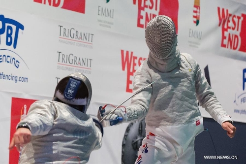 South Korea's Junghwan Kim (R) competes with Hungary's Aron Szilagyi during the final of the Gerevich-Kovacs-Karpati Grand Prix men's saber competition in Budapest, Hungary, on March 9, 2014. (Xinhua/Attila Volgyi)