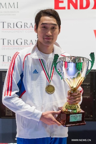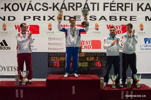 South Korea's Junghwan Kim celebrates during the awarding ceremony of the Gerevich-Kovacs-Karpati Grand Prix men's saber competition in Budapest, Hungary, on March 9, 2014. (Xinhua/Attila Volgyi)