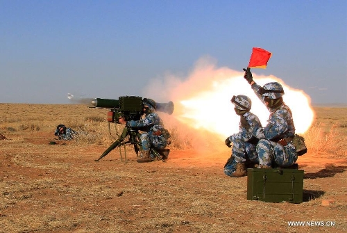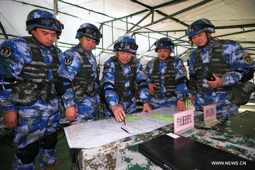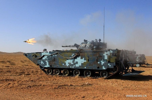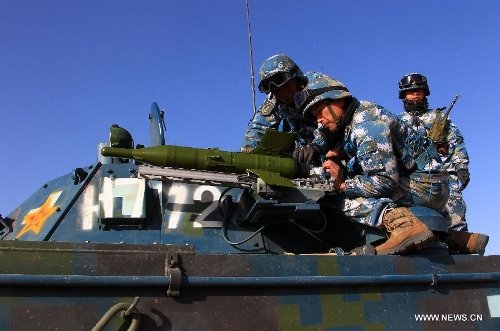 Marines participate in a war game in north China's Inner Mongolia Autonomous Region, March 15, 2014. The marine corps with the Chinese navy on Friday concluded the war game to practise combat abilities in cold environments, according to military sources. (Xinhua/Zha Chunming)