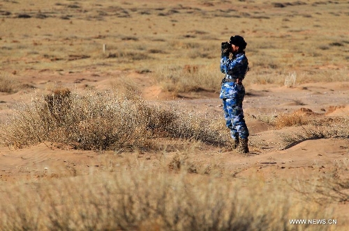 A marine participates in a war game in north China's Inner Mongolia Autonomous Region, March 15, 2014. The marine corps with the Chinese navy on Friday concluded the war game to practise combat abilities in cold environments, according to military sources. (Xinhua/Zha Chunming)