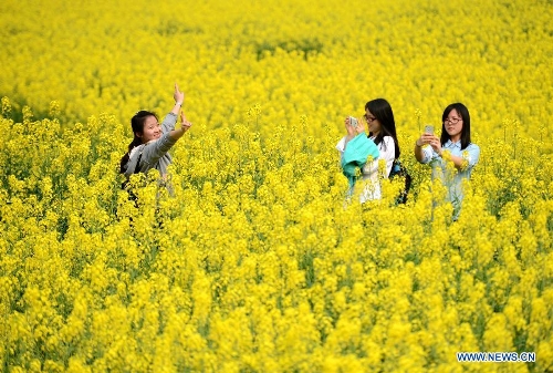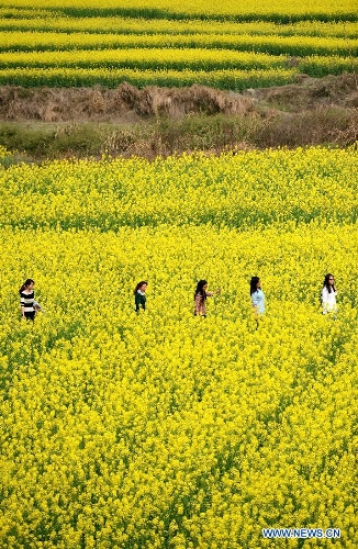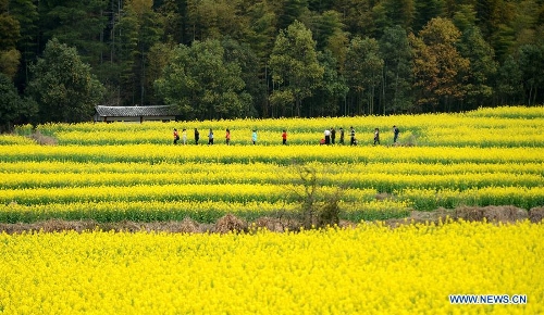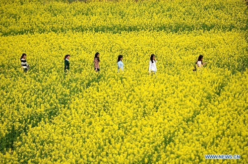 Tourists walk among the blooming rape flowers in Panxi Village, Nanchang, East China's Jiangxi Province, March 18, 2014. (Xinhua/Zhou Ke)