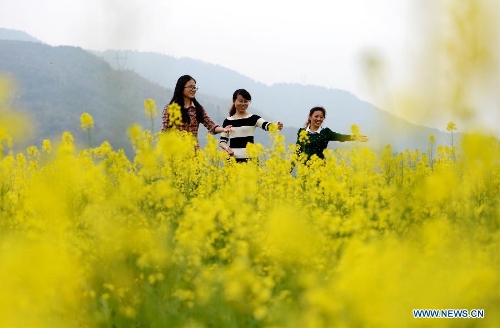 Tourists enjoy the scenery of blooming rape flowers in Panxi Village, Nanchang, East China's Jiangxi Province, March 18, 2014. (Xinhua/Zhou Ke)