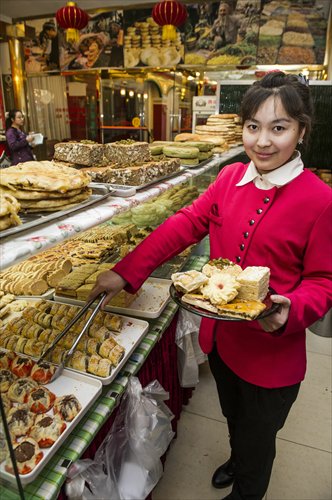 A waitress at the Xinjiang Restaurant affiliated with Urumqi's liaison office in Beijing poses with local pastries. Photo: Li Hao/GT