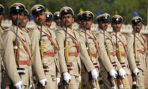 Members of the Karnataka Industrial Security Force march during a ceremonial parade of some 132 sub-Inspectors and executives at the National Industrial Security Academy (NISA) in Hyderabad, India on Thursday. NISA is the premier training institution for India's Central Industrial Security Force. Photo: AFP