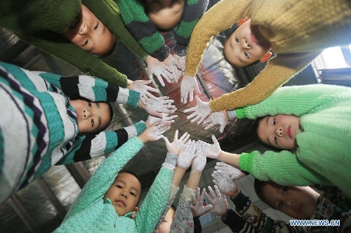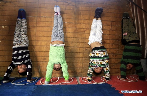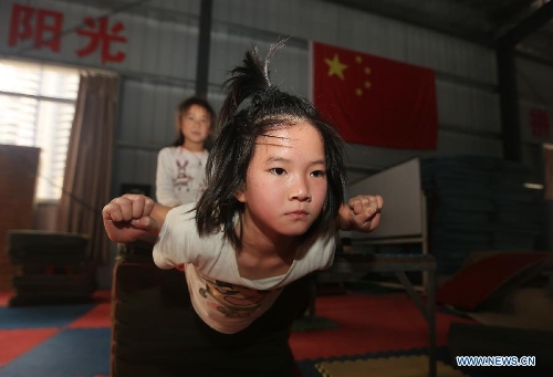 Children practice handstands at the Gymnastic and Diving Base of Shuinan Elementary School in Ganzhou, East China's Jiangxi Province, March 21, 2014. The base, which was founded in 2012, has trained many divers for the provincial diving team. Currently, more than 400 children aged from 4 to 9 receive training in the school. (Xinhua/Chen Dichang)