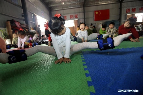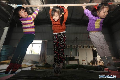Children have their legs tied by sandbags as they practice basic gymnastic movements at the Gymnastic and Diving Base of Shuinan Elementary School in Ganzhou, East China's Jiangxi Province, March 21, 2014. The base, which was founded in 2012, has trained many divers for the provincial diving team. Currently, more than 400 children aged from 4 to 9 receive training in the school. (Xinhua/Chen Dichang)