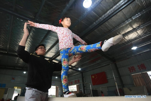 A girl practices basic gymnastic movements on a balance beam under guidance of a teacher at the Gymnastic and Diving Base of Shuinan Elementary School in Ganzhou, East China's Jiangxi Province, March 21, 2014. The base, which was founded in 2012, has trained many divers for the provincial diving team. Currently, more than 400 children aged from 4 to 9 receive training in the school. (Xinhua/Chen Dichang)