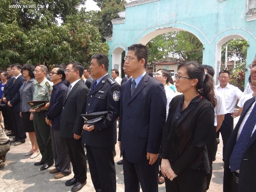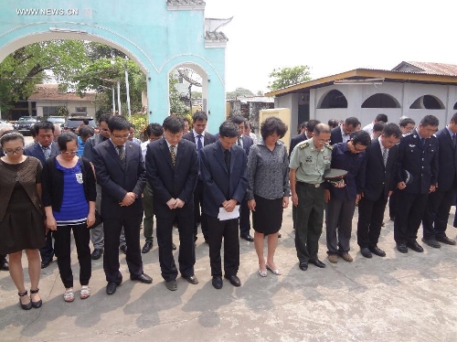 Members of the Chinese Embassy and institutions in Myanmar stand in silent tribute at the Cemetery of the Chinese Expeditionary Army in Toungoo, Myanmar, on April 4, 2014, ahead of China's traditional Qingming Festival, or Tomb-sweeping Day. (Xinhua/Zhang Yunfei)