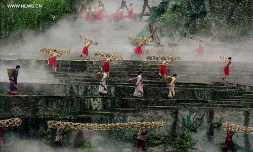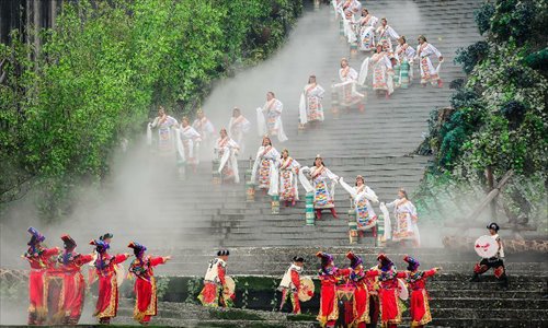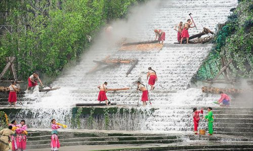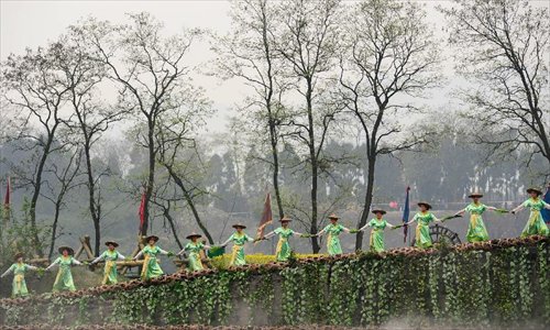 People perform during a ceremony to offer sacrifices to water at the Dujiang Dam, an ancient but still operating irrigation project, in southwest China's Sichuan Province, April 5, 2014, the day of Chinese traditional Qingming Festival. The world's oldest irrigation project was built in 256 BC by local governor Li Bing during the Warring States (475-221 BC). The ceremony is held every year at the Qingming Festival to pray for favourable weather and commemorate the contributions made by Li Bing.Photo:Xinhua