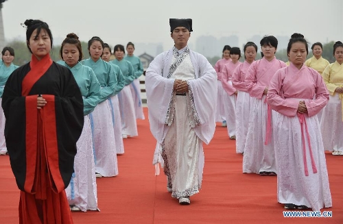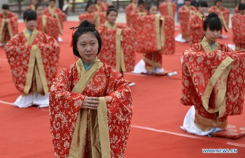 A Confucian coming of age ceremony for teenage girls is held in Xi'an, capital of northwest China's Shaanxi Province, April 6, 2014. More than 50 teenage girls attended a Ji Li, the Confucian-style coming of age ceremony for female, here on Sunday. The ceremony was organized by local fans of Hanfu, the traditional Chinese costume, and followed typical Ji Li practices which include making hair buns, attaching hairpins and paying tribute to Huangdi, the common ancestor of the Chinese. (Xinhua/Liu Xiao)