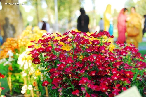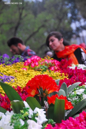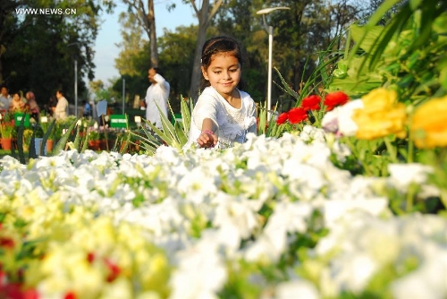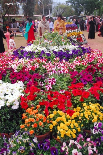 People enjoy flowers on the last day of a spring flower show in Islamabad, capital of Pakistan, on April 6, 2014. Flowers are in full bloom as temperature rises in Pakistan. (Xinhua/Saadia Seher)