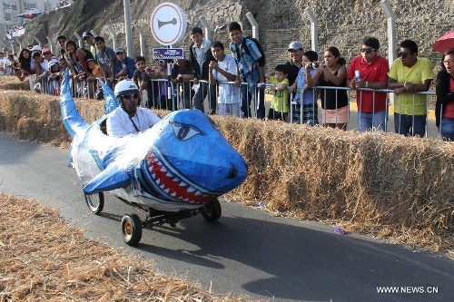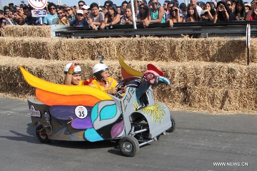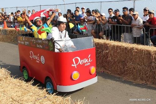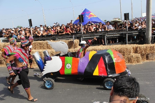 People participate in the "Red Bull's Crazy Cars" race, in San Miguel district, Lima department, Peru, on April 6, 2014. Red Bull's Crazy Cars is a motorless vehicle competition in a 400 meter track, where the best times, creativity on designs, and the ability to entertain the public will be evaluated. (Xinhua/Luis Camacho)
