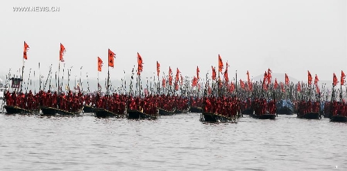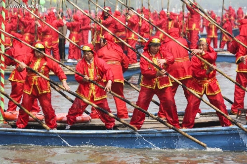 Participants strive to paddle during the 2014 Qintong Boats Gathering Festival in Taizhou City, east China's Jiangsu Province, April 8, 2014. The festival, which lasts from April 5 to May 3, attracted more than 400 boats and over 10,000 participants. The Qintong Boats Gathering Festival was listed as the state-level intangible cultural heritage in 2008. (Xinhua/Tang Dehong)