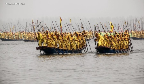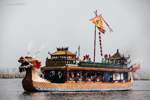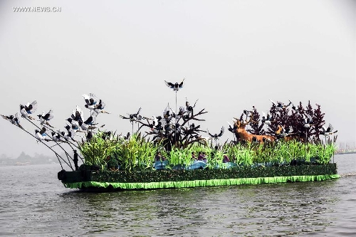 A decorated boat performs during the 2014 Qintong Boats Gathering Festival in Taizhou City, east China's Jiangsu Province, April 8, 2014. The festival, which lasts from April 5 to May 3, attracted more than 400 boats and over 10,000 participants. The Qintong Boats Gathering Festival was listed as the state-level intangible cultural heritage in 2008. (Xinhua/Tang Dehong)