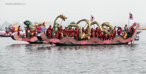 Farmers play the dragon dance on a decorated boat during the 2014 Qintong Boats Gathering Festival in Taizhou City, east China's Jiangsu Province, April 8, 2014. The festival, which lasts from April 5 to May 3, attracted more than 400 boats and over 10,000 participants. The Qintong Boats Gathering Festival was listed as the state-level intangible cultural heritage in 2008. (Xinhua/Tang Dehong)