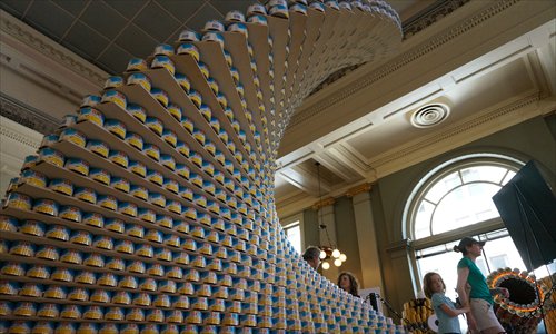 Visitors pass by a large sculpture made from pineapple cans being exhibited at the eighth CANstructionLA Event in Los Angeles. Local architects, designers and engineers constructed large-scale sculptures made from canned food in a food drive to benefit the homeless and low-income families. Photo: Yu Yan