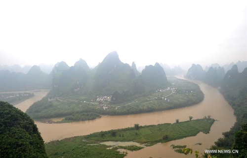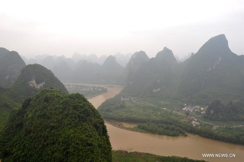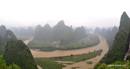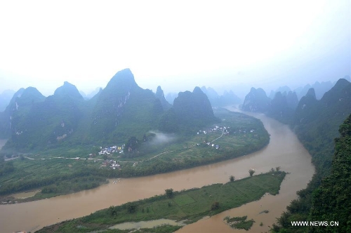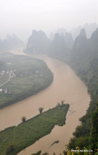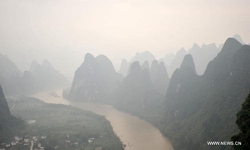 Photo taken on April 12, 2014 shows the scene of Lijiang River permeated with mist, south China's Guangxi Zhuang Autonomous Region. (Xinhua/Lu Bo'an)