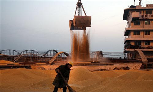 A worker shovels soybeans in a harbor in Nantong, Jiangsu Province, January 31, 2014. Photo: IC