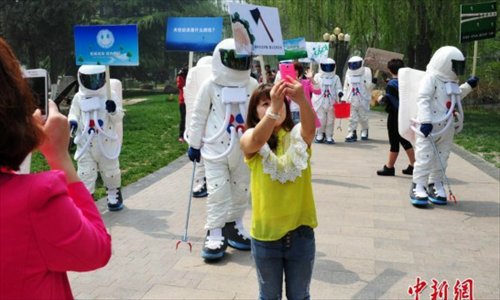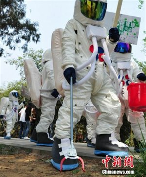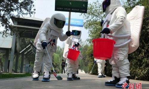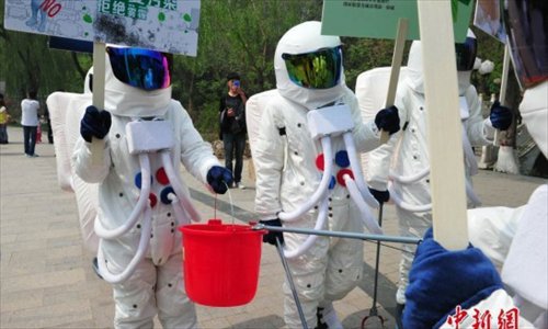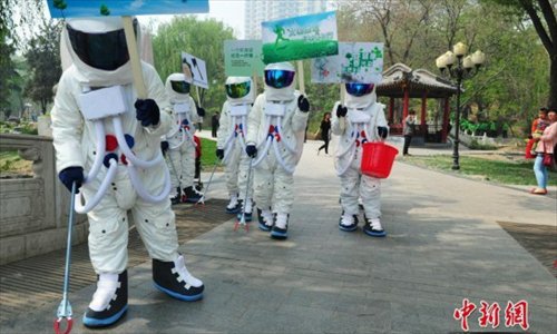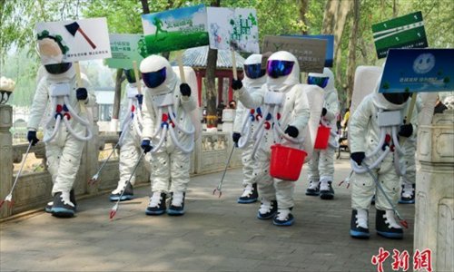 A group dressed in astronaut-inspired survival suits pick up litter at a park in Shijiazhuang, Hebei Province on April 14, as part of a campaign to promote environmental protection. According to participants in the activity, entitled "Future of No Future", mankind will be forced to wear protective suits in the future if we continue polluting the environment. Photo: Chinanews.com