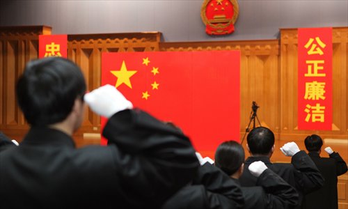 New judges in Shenyang, Liaoning Province take an oath to strictly enforce the law, serve the people, and be honest and upright, on January 14, 2013. Photo: CFP