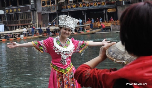Tourists take photos at the Fenghuang ancient town, in Xiangxi Tujia-Miao Autonomous Prefecture of central China's Hunan Province, April 22, 2014. (Xinhua/Long Hongtao)