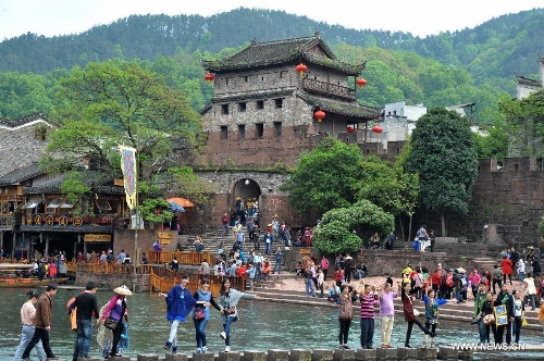 Tourists visit the Fenghuang ancient town, in Xiangxi Tujia-Miao Autonomous Prefecture of central China's Hunan Province, April 22, 2014. (Xinhua/Long Hongtao)
