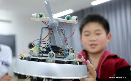A student shows his firefighting robot in Weifang, east China's Shandong Province, April 22, 2014. About 80 teams from middle and primary schools of the city took part in the robot competition. (Xinhua/Zhang Chi)