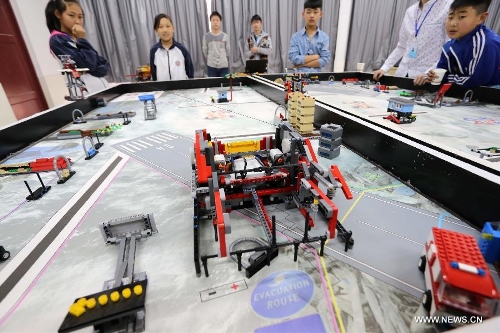 Students compete with their robots in Weifang, east China's Shandong Province, April 22, 2014. About 80 teams from middle and primary schools of the city took part in the robot competition. (Xinhua/Zhang Chi)