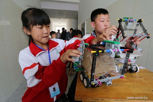 Two students check their carrier robots in Weifang, east China's Shandong Province, April 22, 2014. About 80 teams from middle and primary schools of the city took part in the robot competition. (Xinhua/Zhang Chi)