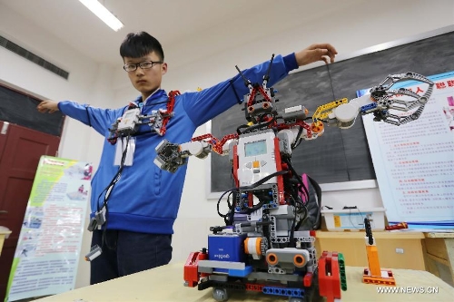 A student controls his robot with body movements in Weifang, east China's Shandong Province, April 22, 2014. About 80 teams from middle and primary schools of the city took part in the robot competition. (Xinhua/Zhang Chi)