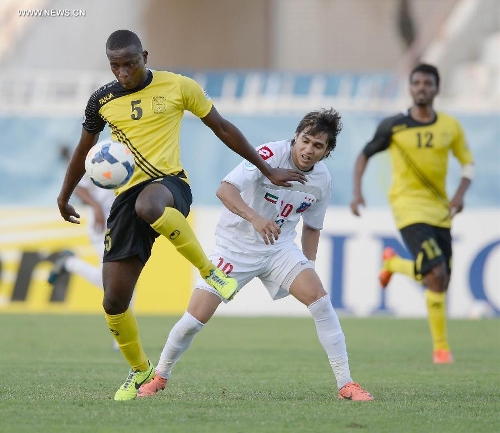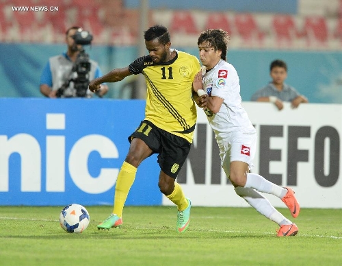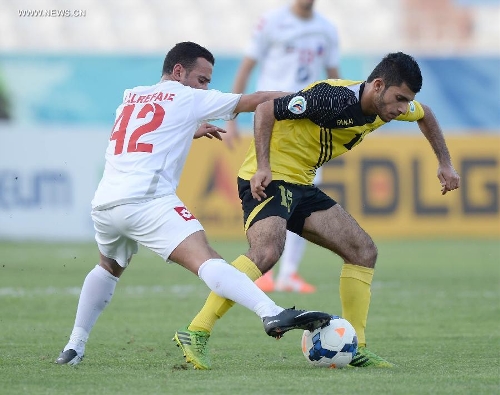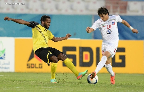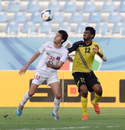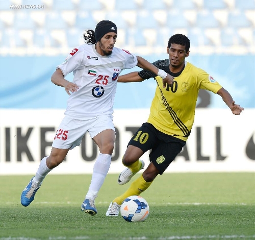 Fahad Jahel(L) of Kuwait's Al Kuwait SC vies for the ball with Mohamed Salim of Oman's fanja SC during their AFC Cup football match in Kuwait City, Kuwait on April 24, 2014. Kuwait's Al Kuwait SC won 4-0. (Xinhua/Noufal Ibrahim)