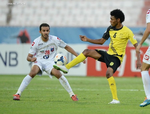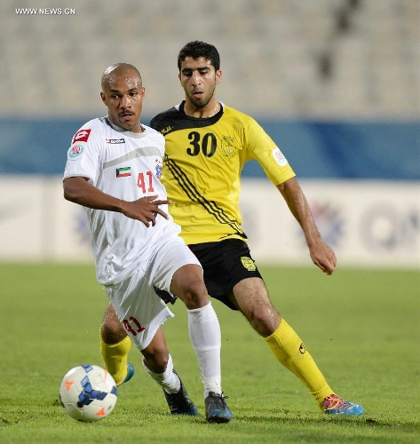 Rogerio de Assis(R) of Kuwait's Al Kuwait SC vies for the ball with Nadhir Maskari of Oman's fanja SC during their AFC Cup football match in Kuwait City, Kuwait on April 24, 2014. Kuwait's Al Kuwait SC won 4-0. (Xinhua/Noufal Ibrahim)