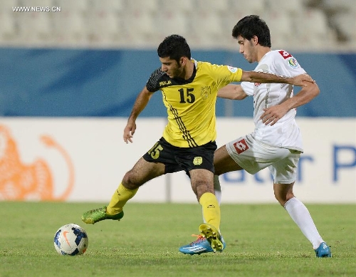 Ahmad sawer(L) of Kuwait's Al Kuwait SC vies for the ball with Ahmed Mubarak of Oman's fanja SC during their AFC Cup football match in Kuwait City, Kuwait on April 24, 2014. Kuwait's Al Kuwait SC won 4-0. (Xinhua/Noufal Ibrahim)