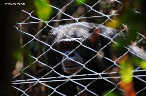 A chimpanzee looks at tourists from inside of the wire netting in Tacugama Chimpanzee Sanctuary of Sierra Leone, April 28, 2014. Located close to Freetown, the capital of Sierra Leone, Tacugama Chimpanzee Sanctuary covers 0.4 sqaure kilometers of the 176.88 sqaure kilometers Western Area Peninsula Forest Reserve. Established by Bala Amarasekaran in 1995, Tacugama now cares for over 100 chimpanzees under the work of nearly 30 staffs in several forested enclosures. (Xinhua/Lin Xiaowei)
