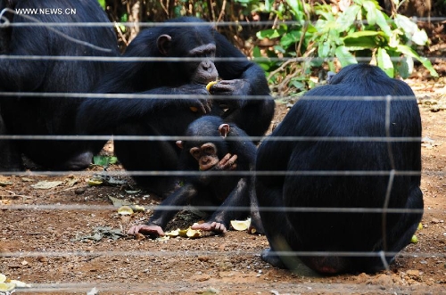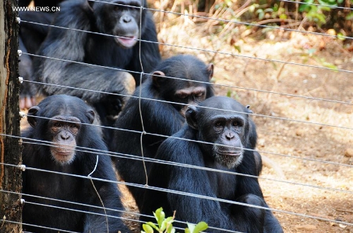 Chimpanzees wait for food in Tacugama Chimpanzee Sanctuary of Sierra Leone, April 28, 2014. Located close to Freetown, the capital of Sierra Leone, Tacugama Chimpanzee Sanctuary covers 0.4 sqaure kilometers of the 176.88 sqaure kilometers Western Area Peninsula Forest Reserve. Established by Bala Amarasekaran in 1995, Tacugama now cares for over 100 chimpanzees under the work of nearly 30 staffs in several forested enclosures. (Xinhua/Lin Xiaowei)