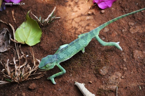A chameleon crawls in the forest of Tacugama Chimpanzee Sanctuary in Sierra Leone, April 28, 2014. Located close to Freetown, the capital of Sierra Leone, Tacugama Chimpanzee Sanctuary covers 0.4 sqaure kilometers of the 176.88 sqaure kilometers Western Area Peninsula Forest Reserve. Established by Bala Amarasekaran in 1995, Tacugama now cares for over 100 chimpanzees under the work of nearly 30 staffs in several forested enclosures. (Xinhua/Lin Xiaowei)