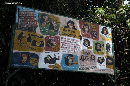 The bulletin board shows various kinds of chimpanzee's "language" in the form of comics in Tacugama Chimpanzee Sanctuary of Sierra Leone, April 28, 2014. Located close to Freetown, the capital of Sierra Leone, Tacugama Chimpanzee Sanctuary covers 0.4 sqaure kilometers of the 176.88 sqaure kilometers Western Area Peninsula Forest Reserve. Established by Bala Amarasekaran in 1995, Tacugama now cares for over 100 chimpanzees under the work of nearly 30 staffs in several forested enclosures. (Xinhua/Lin Xiaowei)