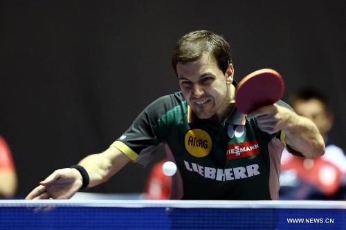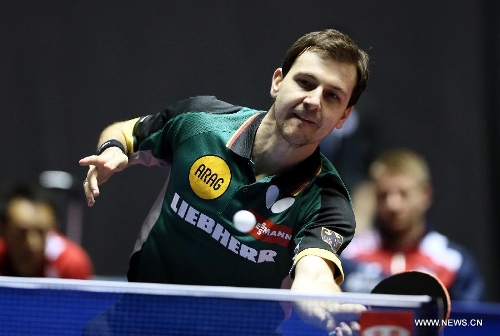 Timo Boll of Germany hits a return during his men's singles round three match against Andrej Gacina of Croatia at the 2014 World Team Table Tennis Championships in Tokyo on April 30, 2014. Boll won 3-1 and Germany won 3-0. (Xinhua/Li Peng)